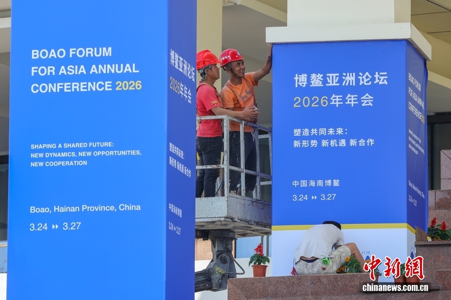 3月17日,博鰲亞洲論壇2026年年會(huì)各項(xiàng)籌備工作正有序推進(jìn),海南博鰲街頭的盛會(huì)氛圍日漸濃厚。以“塑造共同未來:新形勢(shì)、新機(jī)遇、新合作”為主題的博鰲亞洲論壇2026年年會(huì)將于3月24日至27日在海南博鰲召開。圖為工作人員在博鰲亞洲論壇永久會(huì)址安裝年會(huì)主題展板。中新社記者 駱云飛 攝