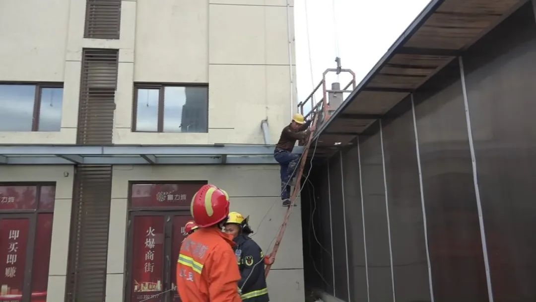 指揮員立即命令第一營救小組前往建筑內(nèi)部,試圖通過住戶窗戶進(jìn)行營救,當(dāng)營救小組到達(dá)指定位置后發(fā)現(xiàn),消防隊(duì)員與被困工人相距太遠(yuǎn),空中營救的危險性和困難程度較高。消防隊(duì)員通過與被困工人交流,提醒他抓好繩索,安撫他的情緒。很快,第二組營救的消防隊(duì)員利用掛鉤梯爬到二層位置把纏繞的鋼絲繩拉到地面,4人分別拽一根鋼絲繩,松解纏繞的鋼絲繩,使升降機(jī)恢復(fù)運(yùn)行。而此時,天氣逐漸放晴,風(fēng)力也開始減弱,在消防隊(duì)員們的努力下,升降機(jī)緩緩下降,18時12分,被困的工人安全降落到地面。