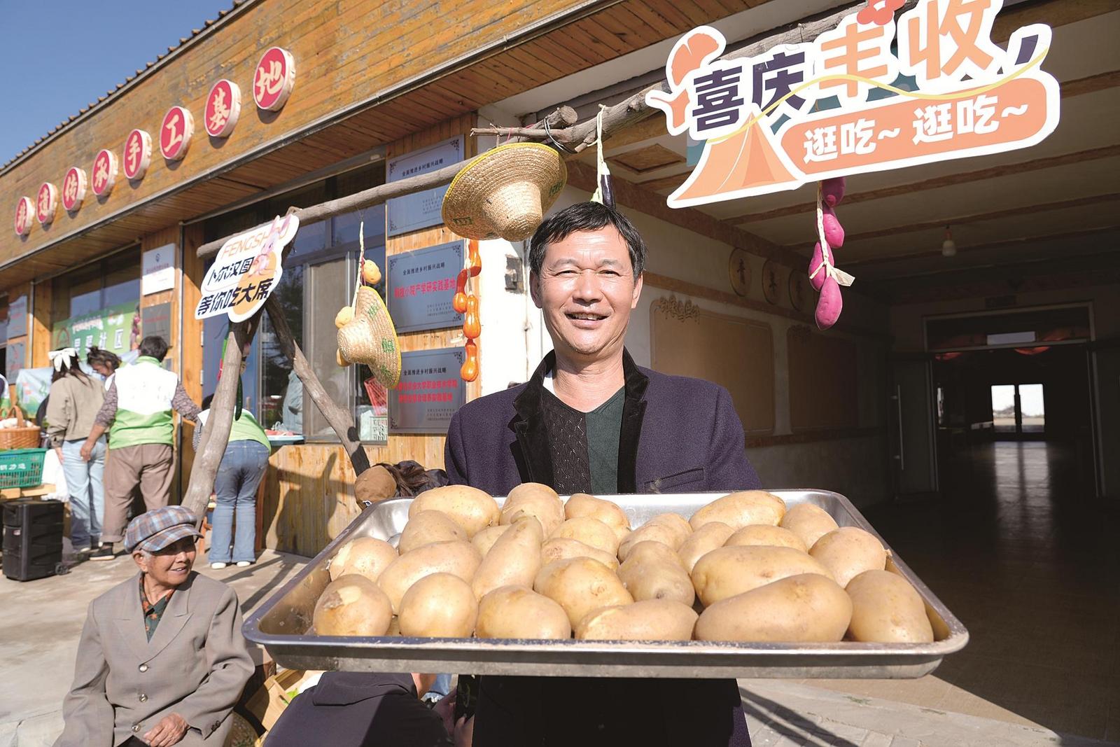 豐收節(jié)上,一村民端著自家種的土豆供人們免費品嘗。