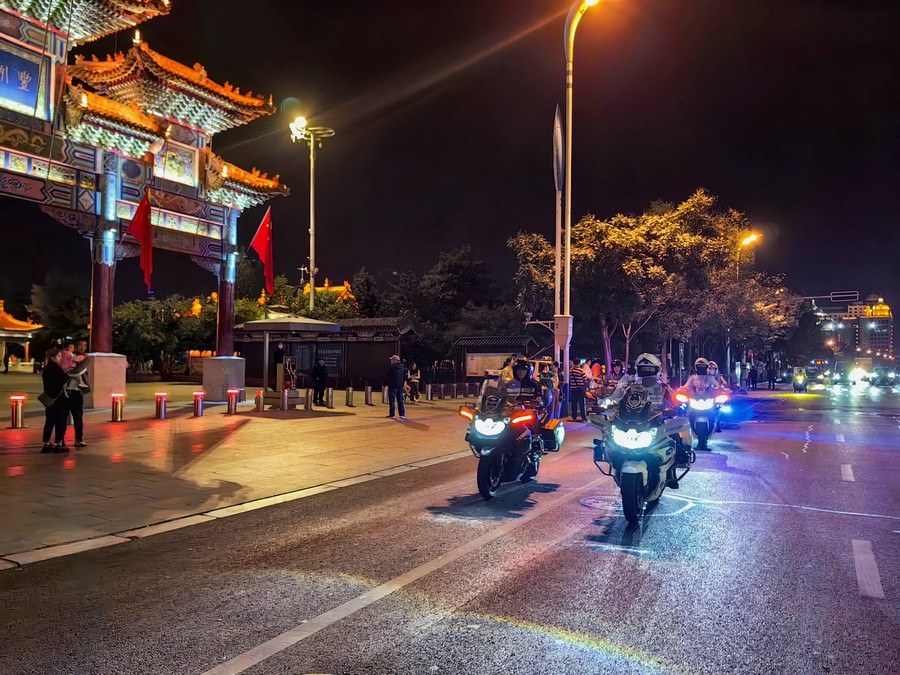 中秋、國慶兩節(jié)期間,呼和浩特市公安局反恐怖和特巡警支隊(duì)?wèi)?zhàn)鷹突擊隊(duì)與交警支隊(duì)停放管理大隊(duì)鐵騎中隊(duì),聯(lián)合開展巡邏防控工作,并組成了一支騎警處突機(jī)動(dòng)隊(duì),成了呼和浩特大街小巷一道亮麗的風(fēng)景線。圖為中秋節(jié)之夜,這支機(jī)動(dòng)隊(duì)開展聯(lián)合巡邏,守護(hù)青城百姓平安過節(jié)。 王鑫 攝影報(bào)道