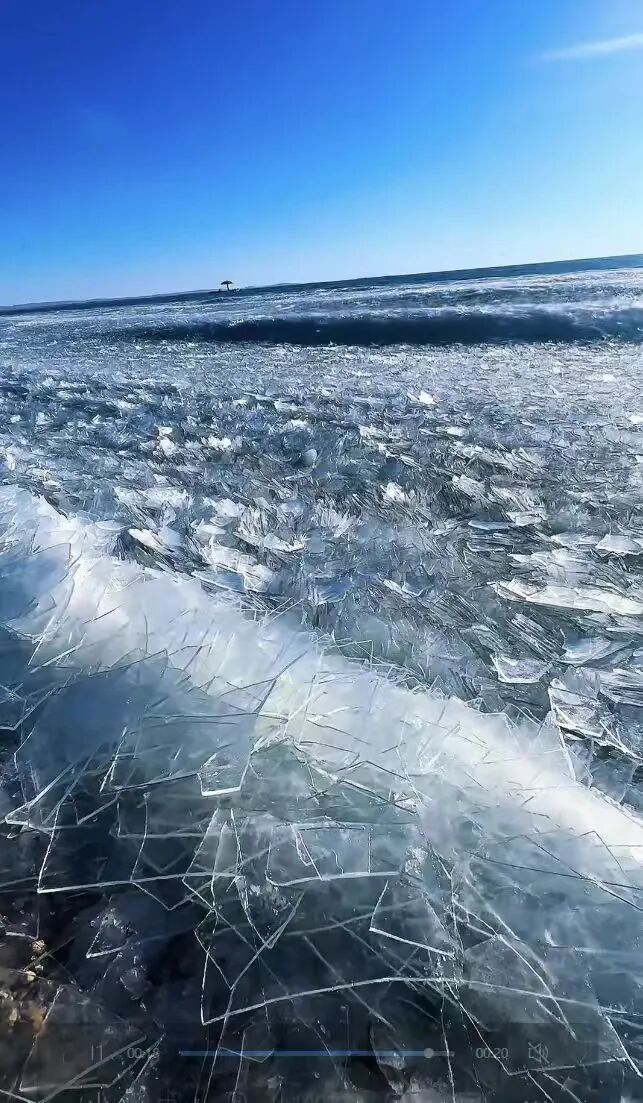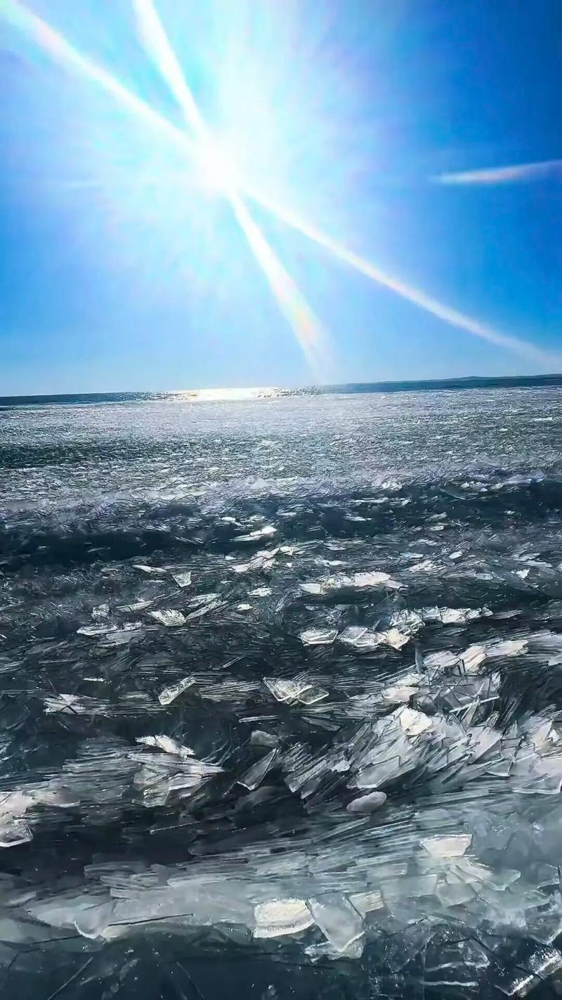 在無人機(jī)航拍視角下,2239.9平方公里的湖面上,冰排與未完全封凍的水域交織分布,白色冰體與湛藍(lán)湖水相映,宛如大地鋪展的巨型碧玉上鑲嵌的銀紋??拷行牡膮^(qū)域,新凍結(jié)的冰層還呈現(xiàn)出細(xì)膩的冰花紋路,而岸邊的冰排群中,隱約可見因地下泉眼涌動形成的“清眼”,表面覆著薄霜,在陽光下泛著微光。