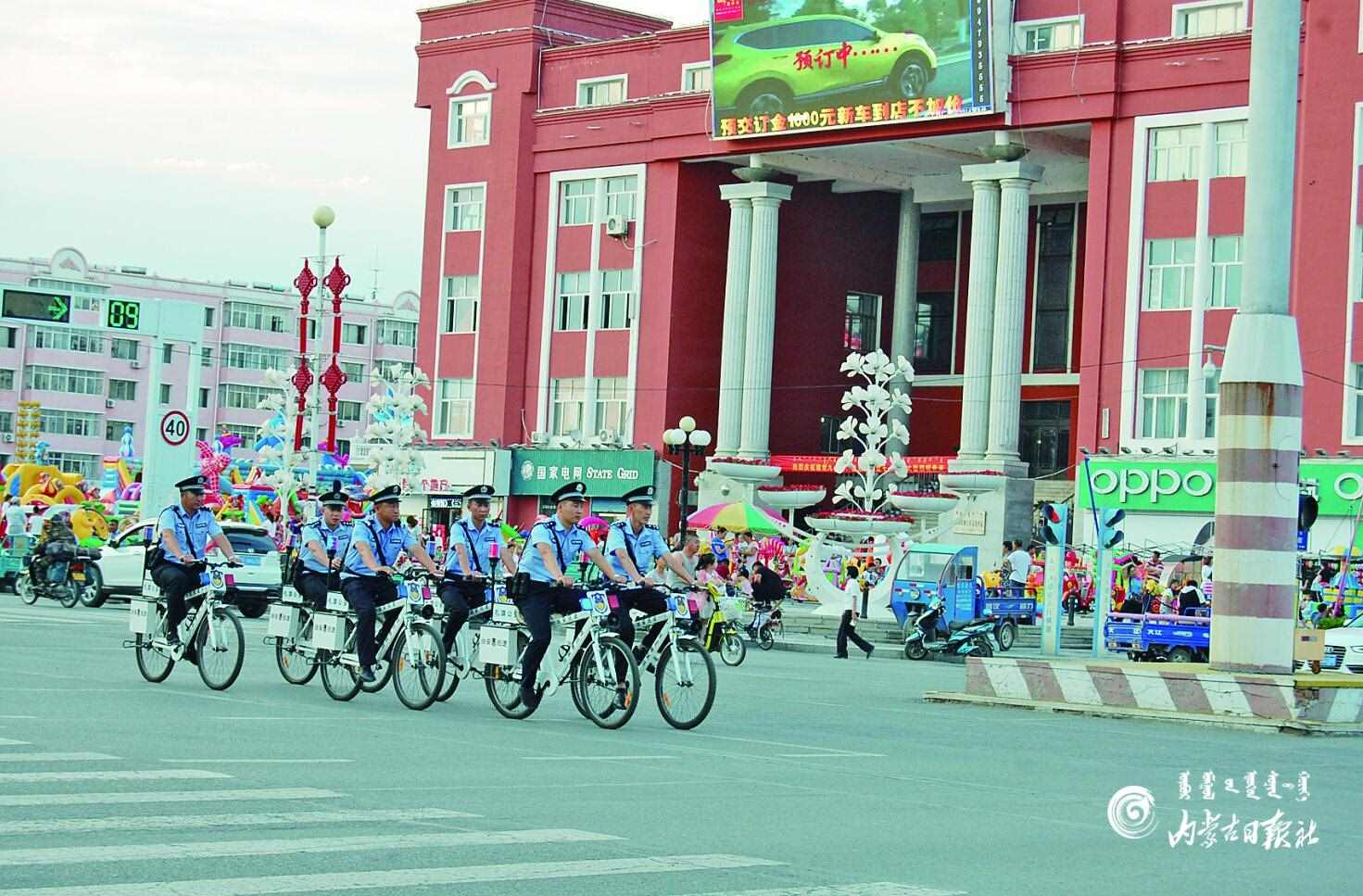 興安盟扎賚特旗公安局民警騎自行車(chē)在主干道巡邏。為確保社會(huì)面 安全穩(wěn)定,每晚7點(diǎn)至9點(diǎn),民警上街開(kāi)展巡邏防控,及時(shí)發(fā)現(xiàn)安全隱患,增 強(qiáng)群眾安全感。 李健 攝