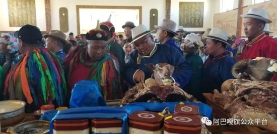 早上八點(diǎn)整,別力古臺(tái)祭祀以傳統(tǒng)的蒙古族祭祀儀軌進(jìn)行。上千民眾身著盛裝,從旅游度假區(qū)的正門排成數(shù)列長(zhǎng)隊(duì),每支隊(duì)伍最前面的代表托舉著盛有“術(shù)思”(整羊)的大木盤,依次步入祭祀宮。祭祀活動(dòng)正式開始,信眾們紛紛獻(xiàn)上手中的貢品和哈達(dá),他們神情莊重,十分虔誠(chéng)的向別力古臺(tái)頂禮膜拜,祈禱草原風(fēng)調(diào)雨順,五畜興旺。