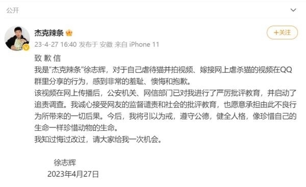 27日16時40分,@杰克辣條 在微博發(fā)表了署名“徐志輝”的致歉信稱,對于自己虐待貓并拍視頻、嫁接網(wǎng)上虐殺貓的視頻在QQ群里分享的行為,感到非常的羞恥、懊悔和抱歉。該視頻在網(wǎng)上傳播后,公安機關(guān)、網(wǎng)信部門已對其進行了嚴厲批評教育,并啟動了追責調(diào)查。