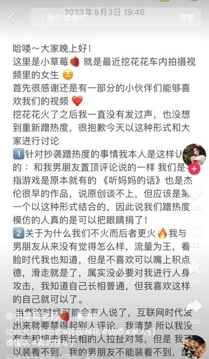 “小草莓老師”也在5月3日發(fā)文回應(yīng)稱,不存在誰是原創(chuàng)的問題。