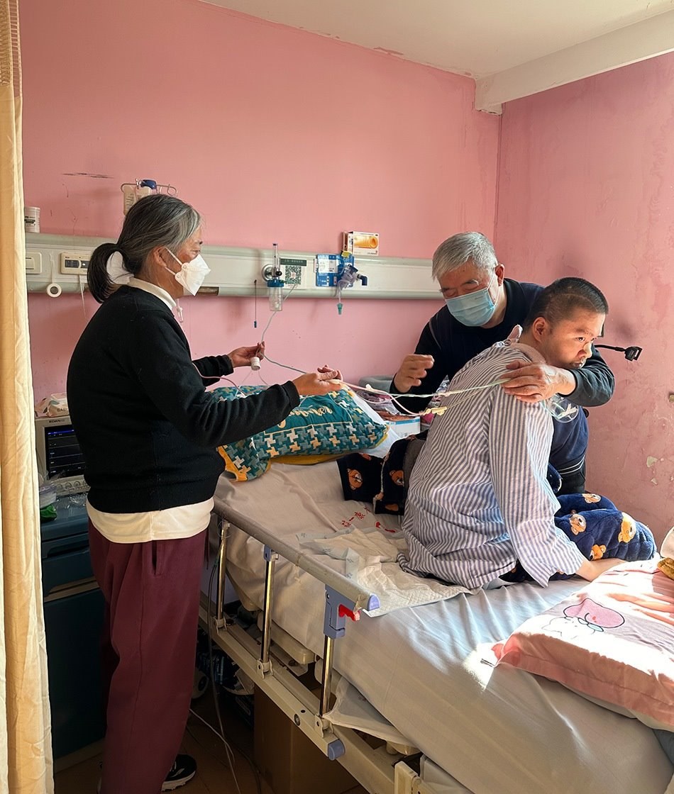 一月上旬的一個(gè)下午,鄭建英像過(guò)去一千多個(gè)日子一樣,坐在兒子床尾的椅子上,盯著他床頭監(jiān)視器的氧保。這幾年,她已經(jīng)形成條件反射,當(dāng)數(shù)值低于92時(shí),她會(huì)從椅子上彈起來(lái)幫他吸痰。