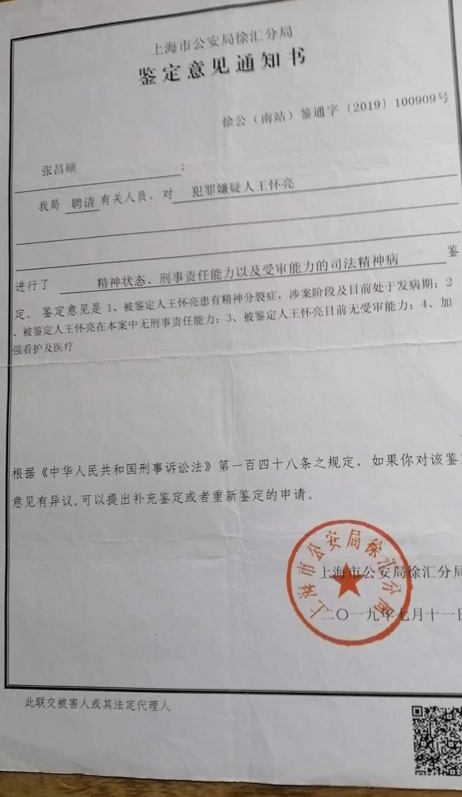 另一份是犯罪嫌疑人王懷亮的“精神狀態(tài)、刑事責(zé)任能力以及受審能力的司法精神病”鑒定書,寫道:王懷亮患有精神分裂癥,涉案階段及目前處于發(fā)病期;在本案中無(wú)刑事責(zé)任能力;目前無(wú)受審能力;加強(qiáng)看護(hù)及醫(yī)療。