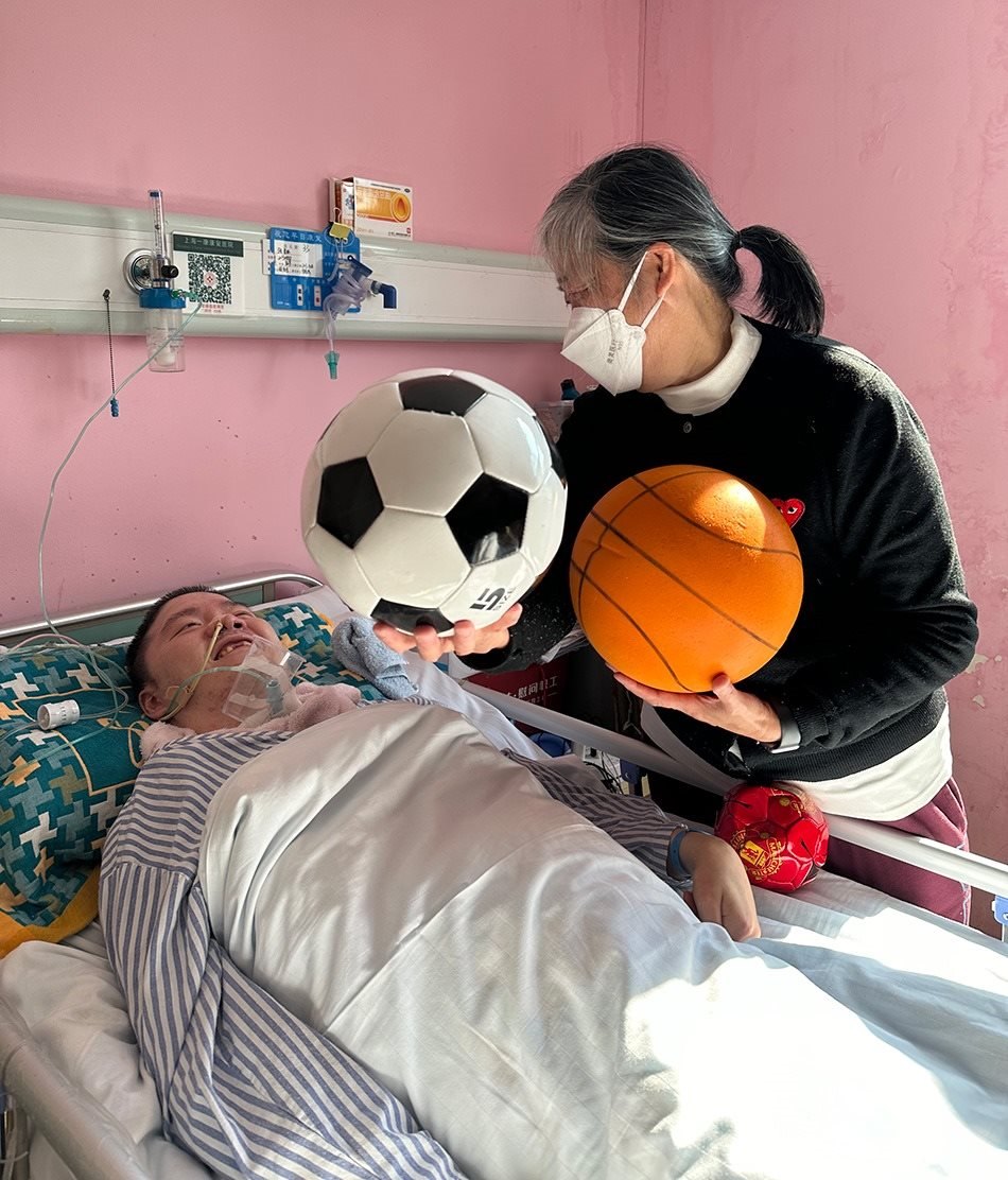 張昌碩恢復(fù)微小意識(shí)后,鄭建英從家里帶了兩顆昌碩最喜歡的足球到病床前,一大一小。每次,她舉起一顆足球放到他眼前,問(wèn)他:“哪只是曼聯(lián)的?”昌碩的視線會(huì)左右移動(dòng),選擇正確的那一顆。