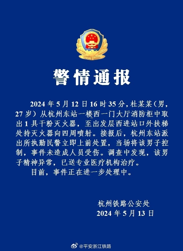 央視網(wǎng)消息:據(jù)“平安浙江鐵路”微博消息,杭州鐵路公安處5月13日通報(bào),2024年5月12日16時(shí)35分,杜某某(男,27歲)從杭州東站一樓西一門(mén)大廳消防柜中取出1具干粉滅火器,至出發(fā)層西進(jìn)站口外扶梯處持滅火器向四周噴射。接報(bào)后,杭州東站派出所執(zhí)勤民警立即上前處置,當(dāng)場(chǎng)將該男子控制,事件未造成人員受傷。調(diào)查中發(fā)現(xiàn),該男子精神異常,已送專業(yè)醫(yī)療機(jī)構(gòu)治療。目前,事件正在進(jìn)一步處理中。