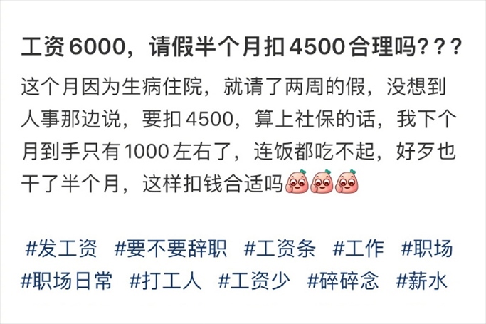 近日,#工資6000請(qǐng)假半個(gè)月被扣4500#的話題登上熱搜,引發(fā)關(guān)注。