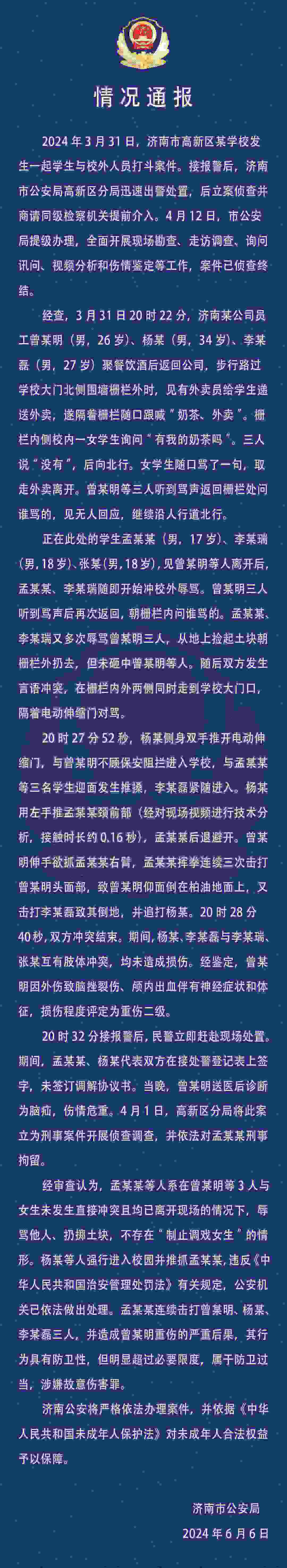 學(xué)生與醉漢沖突、被拘留 濟(jì)南警方:涉事學(xué)生屬于防衛(wèi)過當(dāng)