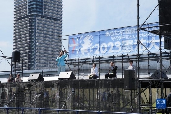 5月3日,在日本東京有明防災(zāi)公園的廣場上,在野黨社民黨黨首福島瑞穗在集會(huì)上發(fā)表演講。新華社記者 張笑宇 攝