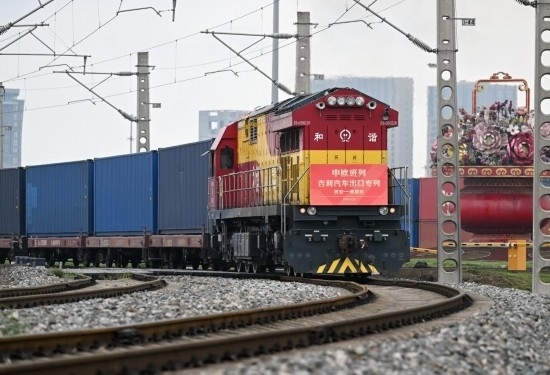 4月23日,中歐班列長(zhǎng)安號(hào)吉利汽車出口專列從西安國(guó)際港站駛出。新華社記者 李一博 攝