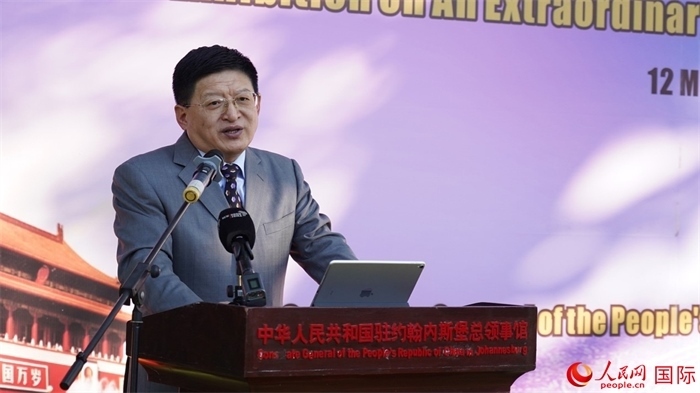 5月12日,中國駐約翰內(nèi)斯堡總領(lǐng)館在館內(nèi)舉辦新時(shí)代中國非凡十年成就圖片展,慶祝中南建交25周年。人民網(wǎng) 劉暢攝