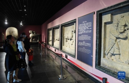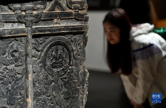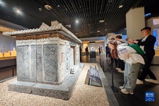 5月8日,游客在西安博物院參觀史君墓石槨。墓主史君是北周涼州薩保,粟特人。石槨整體為中國傳統(tǒng)歇山頂?shù)钐檬浇ㄖ?,四壁浮雕?nèi)容和風格則帶有鮮明的西域特色。