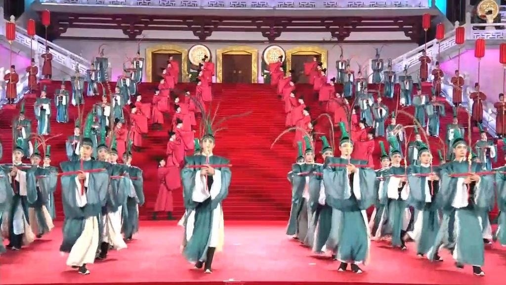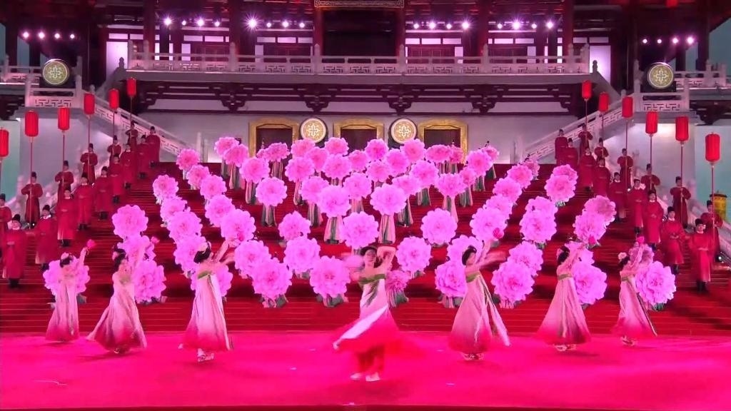 紫云樓前,禮樂和鳴,明快有力的古代佾舞、絢麗婀娜的芙蓉花舞,表達(dá)了古都西安人民的熱情好客,體現(xiàn)了中華文化兼容并蓄的精神風(fēng)貌。