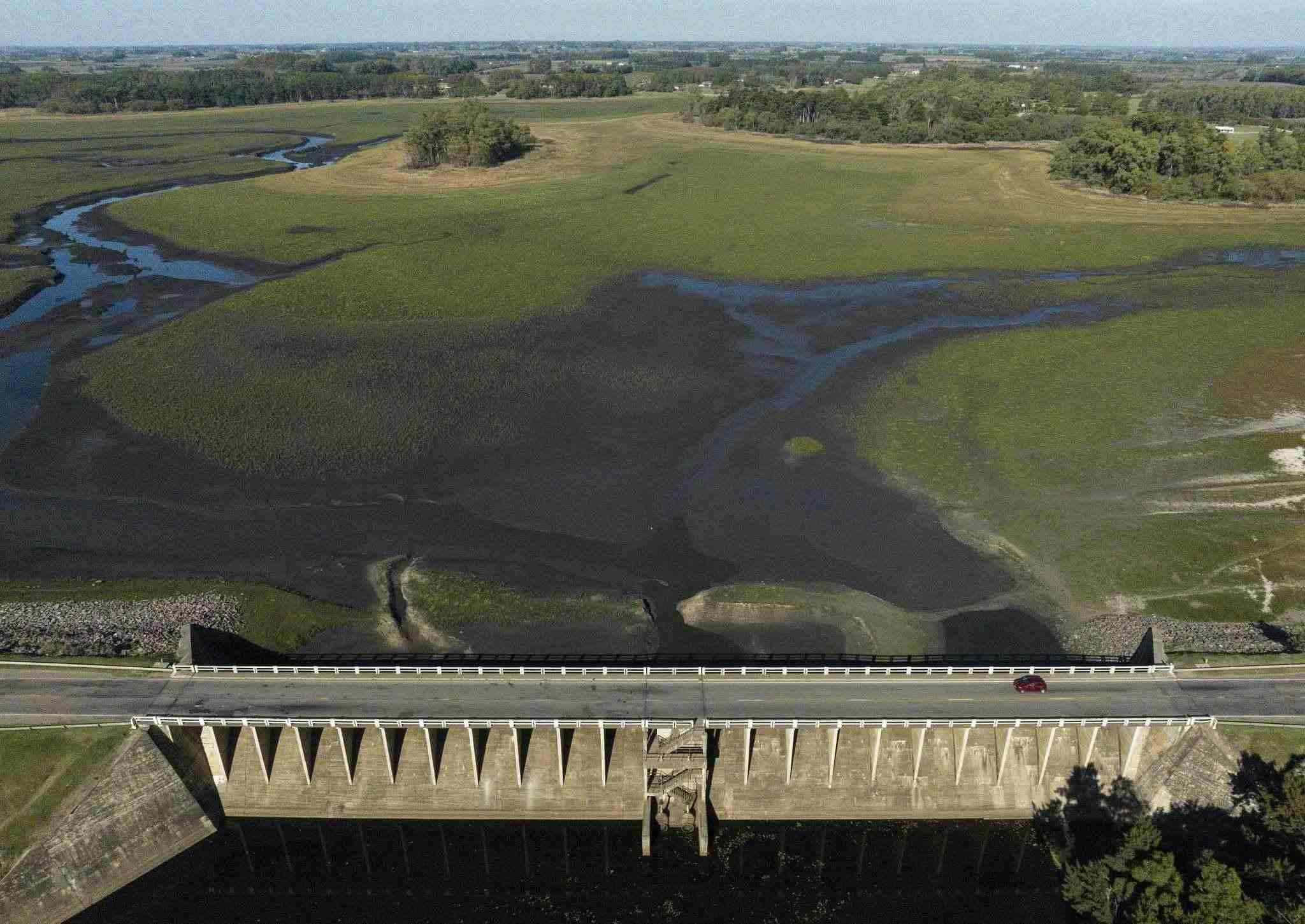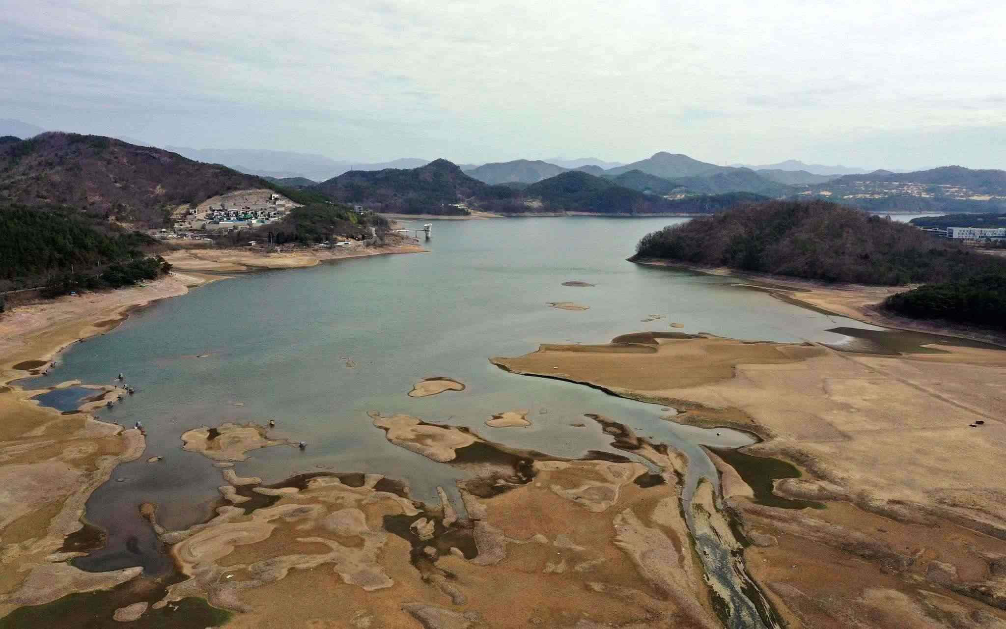 當(dāng)?shù)貢r間2023年3月21日,韓國羅州,羅州湖遭遇嚴(yán)重干旱,水量下降,河床裸露。