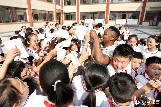 圖為李昊瑞給午亭小學(xué)的學(xué)生簽名留念。人民網(wǎng) 盧鵬宇攝