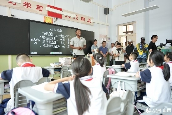 圖為莉迪亞給午亭小學(xué)三年級(jí)一班的同學(xué)贈(zèng)送書法禮物。人民網(wǎng) 盧鵬宇攝