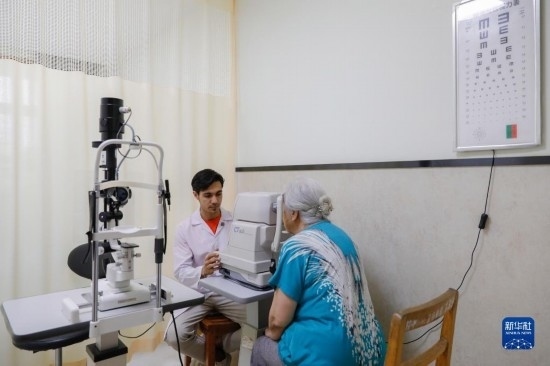甘肅中醫(yī)藥大學(xué)針灸推拿專業(yè)的土庫曼斯坦留學(xué)生迪達(dá)(左)在臨床實習(xí)中為患者檢查眼睛(7月28日攝)。新華社記者 方欣 攝