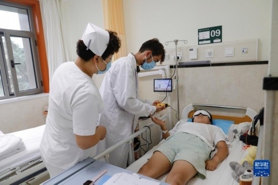 甘肅中醫(yī)藥大學(xué)針灸推拿專業(yè)的塔吉克斯坦留學(xué)生紀(jì)明哲(中)在臨床實習(xí)中為患者進(jìn)行直流電離子導(dǎo)入操作(7月27日攝)。新華社記者 方欣 攝