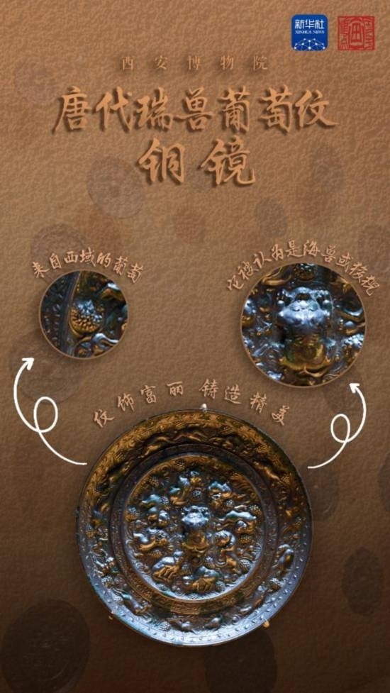 在唐代,我國(guó)銅鏡制作和使用進(jìn)入繁盛時(shí)期,許多通過(guò)絲綢之路傳來(lái)的紋樣被工匠應(yīng)用在銅鏡上。瑞獸葡萄紋銅鏡紋飾富麗、鑄造精美,備受當(dāng)時(shí)民眾的青睞。瑞獸葡萄紋銅鏡將裝飾藝術(shù)和現(xiàn)實(shí)生活緊密結(jié)合,瑞獸象征著敏捷與美好,葡萄則象征著豐收充裕和多子多福,呈現(xiàn)出濃郁的盛唐氣象,是我國(guó)古代中西方文化交流的代表性產(chǎn)物。