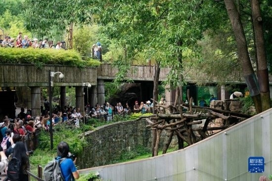 8月21日,游客在美國首都華盛頓史密森學(xué)會國家動物園觀看大熊貓幼崽“小奇跡”過生日。新華社記者 劉杰 攝