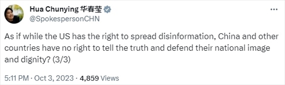 “仿佛美國有權(quán)利散布虛假信息,而中國等國家卻無權(quán)說實話、維護(hù)國家形象和尊嚴(yán)?”