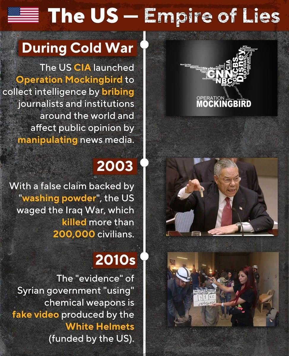 早在冷戰(zhàn)期間,美國中央情報局發(fā)起了“知更鳥計劃”,通過賄賂世界各地的記者和機(jī)構(gòu)來收集情報,并通過操縱新聞媒體來影響公眾輿論。新世紀(jì)借“洗衣粉”“白頭盔”,美國對伊拉克、敘利亞悍然發(fā)動侵略戰(zhàn)爭,造成數(shù)十萬平民死亡。