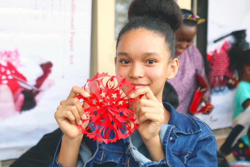 9月23日,盧旺達(dá)首都基加利,在盧旺達(dá)大學(xué)孔子學(xué)院舉辦的“中國文化進(jìn)校園”暨中秋國慶慶?;顒蝇F(xiàn)場,一名女孩展示剪紙成果。(新華社發(fā),黃萬晴攝)