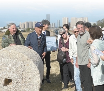 在云南昆明呈貢機(jī)場舊址,代表團(tuán)一行聆聽講解員講述石碾背后的故事。呈貢機(jī)場曾是飛虎隊(duì)在昆明的主要基地之一,機(jī)場建設(shè)期間,當(dāng)?shù)厝嗣窭瓌泳薮笫肫秸艿溃冻銎D苦努力。本報(bào)記者 劉玲玲攝