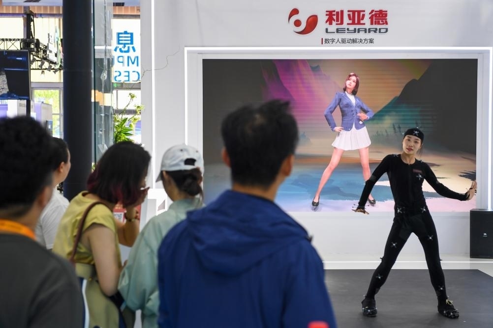 9月5日,在服貿(mào)會首鋼園區(qū)的電信、計算機和信息服務(wù)專題展內(nèi),參觀者觀看一家企業(yè)的數(shù)字人驅(qū)動解決方案演示。新華社記者 鞠煥宗 攝