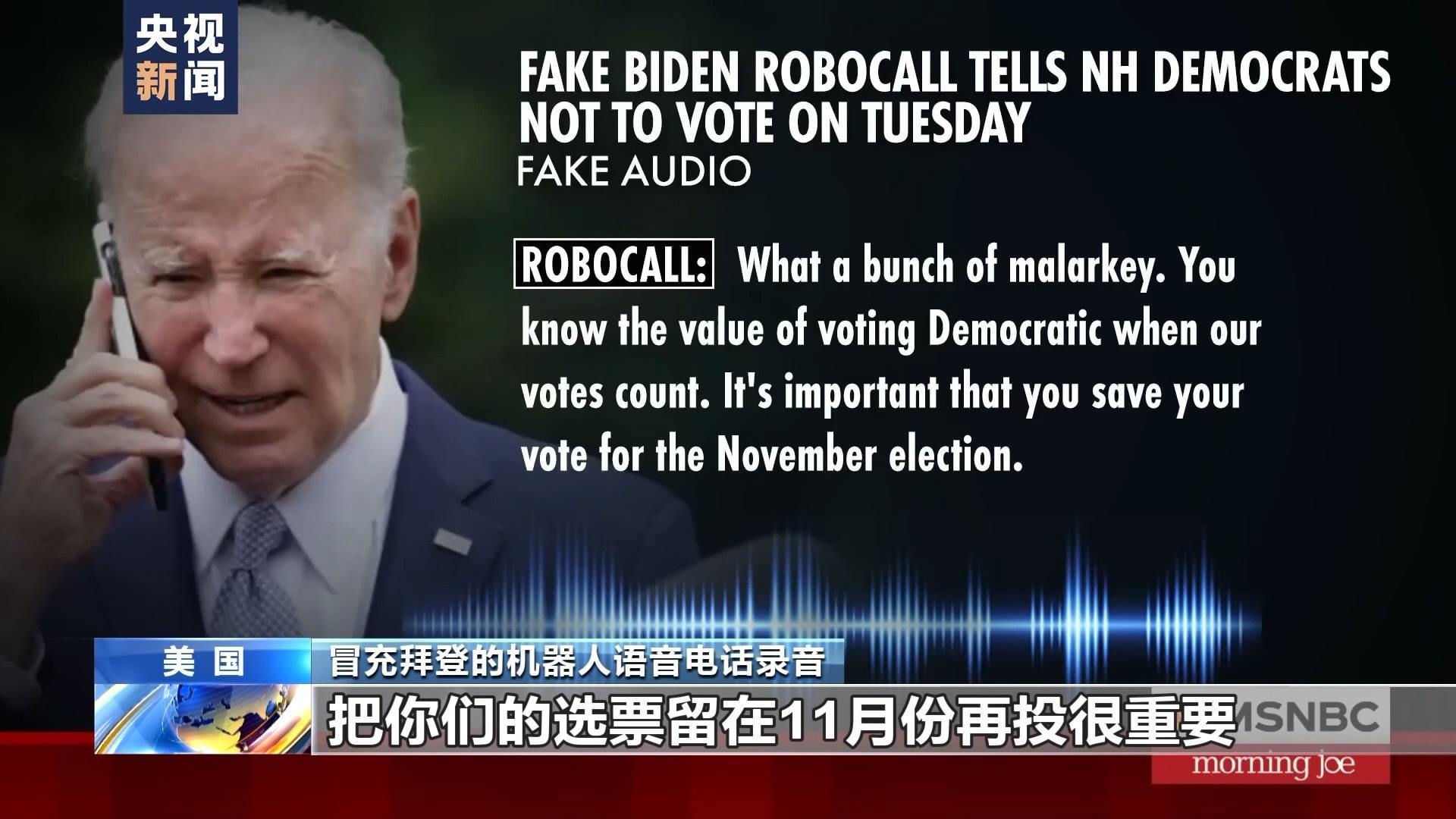 冒充拜登的機(jī)器人語(yǔ)音電話錄音:把你們的選票留在11月份再投很重要。在這周二(23日)投票,只會(huì)讓共和黨人得逞,讓特朗普再次當(dāng)選為共和黨候選人。
