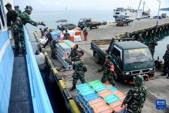 3月25日,在印度尼西亞巴韋安島,印尼軍人搬運(yùn)印尼國(guó)家災(zāi)害管理局發(fā)放的救援物資。