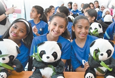 2023年9月17日,在科威特哈瓦利省的科威特中國文化中心,學(xué)習(xí)漢語的孩子們與熊貓玩具合影。阿薩德攝(新華社發(fā))