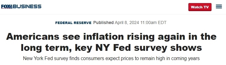 福克斯商業(yè)頻道在其另一篇報(bào)道中提到,據(jù)8日公布的一項(xiàng)紐約聯(lián)邦儲(chǔ)備銀行(Federal Reserve Bank of New York)進(jìn)行的消費(fèi)者預(yù)期調(diào)查顯示,美國(guó)人正在為未來(lái)幾年的高通脹率做準(zhǔn)備,公眾普遍的預(yù)期中值為從現(xiàn)在起一年內(nèi)通脹率將上升3%,與前幾個(gè)月持平,并在未來(lái)幾年通脹將保持高位,這表明他們認(rèn)為粘性通脹恐會(huì)持續(xù)下去。