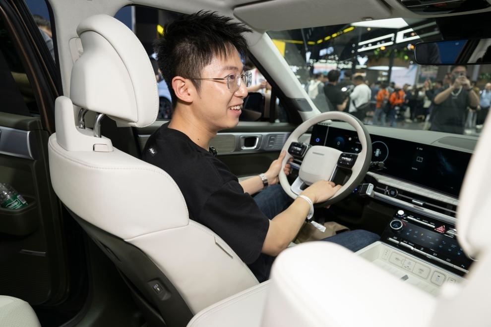 ?4月4日,在巴西圣保羅舉行的巴西防務(wù)展上,參觀者體驗(yàn)一輛經(jīng)過(guò)防彈加固的比亞迪海豹電動(dòng)汽車。新華社記者王天聰攝