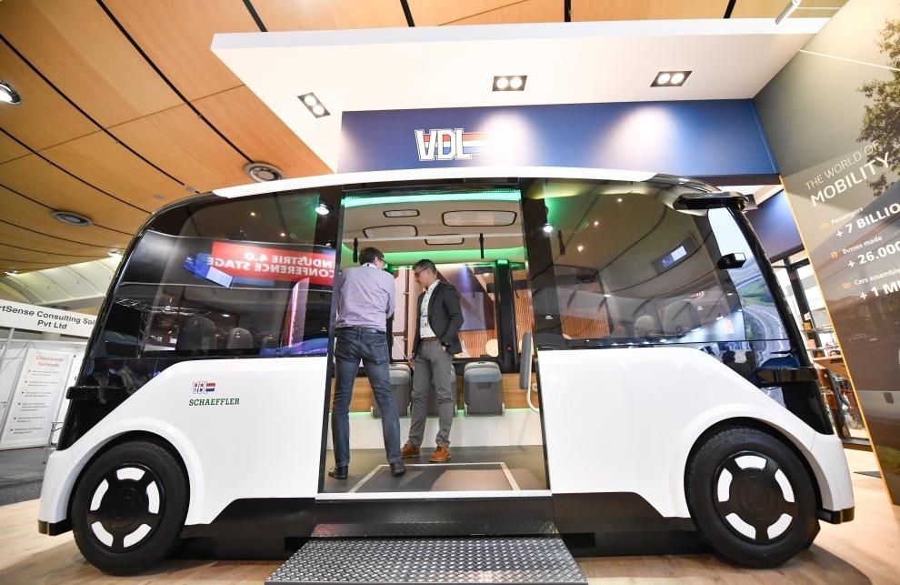 ?4月23日,人們?cè)诘聡?guó)漢諾威工博會(huì)上參觀一款無(wú)人駕駛汽車。新華社記者任鵬飛攝