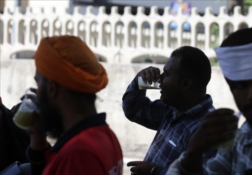5月27日,在印度北部旁遮普邦阿姆利則地區(qū),人們?cè)谘谉岬奈绾蠛嚷愤吺圪u的甘蔗汁來消暑。新華社發(fā)(斯特林格攝)