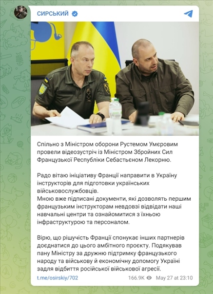5月27日,烏克蘭武裝部隊總司令亞歷山大·瑟爾斯基(Oleksandr Syrskyi)在Telegram平臺上發(fā)文,稱法國有意向烏克蘭派遣教官,培訓(xùn)烏軍人員,并表示已簽署相關(guān)文件,允許首批法國教官訪問烏軍培訓(xùn)中心。
