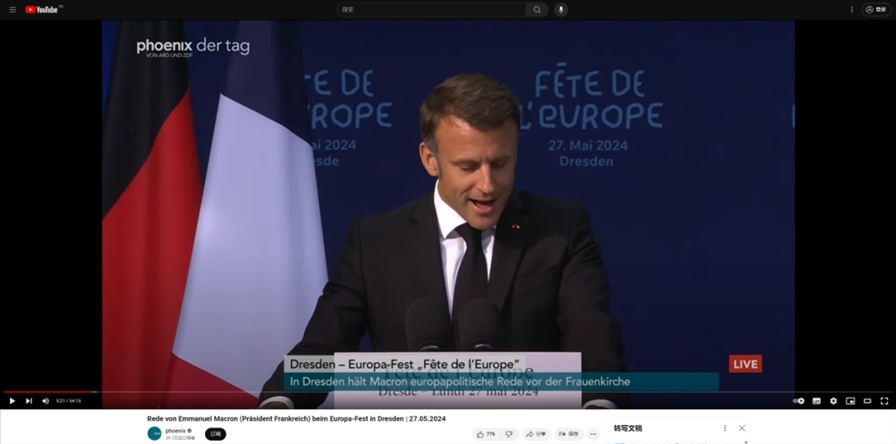Phoenix在其YouTube頻道上播出的馬克龍演講的完整版本截圖。網(wǎng)傳視頻顯示的音頻內(nèi)容與Phoenix播出的馬克龍在德累斯頓進行演講時開篇的音頻一致,且拍攝現(xiàn)場的環(huán)境高度吻合。