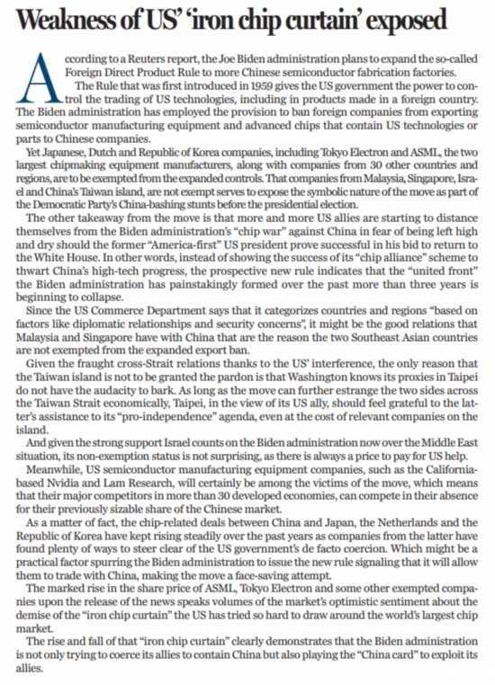 包括東京電子和阿斯麥兩大芯片設備制造商在內(nèi),來自日本、德國、韓國及其他30個國家和地區(qū)的相關企業(yè)將不會受到規(guī)則擴大的影響,但馬來西亞、新加坡、以色列和中國臺灣的相關企業(yè)卻未被豁免。這表明擴大規(guī)則范圍的象征意義遠大于實際意義,實則是民主黨在美國總統(tǒng)大選到來之前抨擊中國的戲碼。