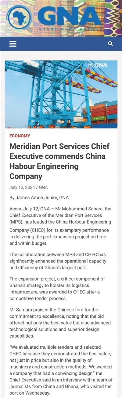中國港灣為港口擴(kuò)建項(xiàng)目提供了先進(jìn)的技術(shù)解決方案和卓越的設(shè)計(jì)能力,并引入了多項(xiàng)創(chuàng)新技術(shù),包括能夠減少港口擁堵的停泊位窗口計(jì)劃,以及用于跟蹤和管理貨運(yùn)的先進(jìn)數(shù)字系統(tǒng),贏得了港口業(yè)主加納子午線港口服務(wù)有限公司高度肯定。——摘自加納通訊社報(bào)道