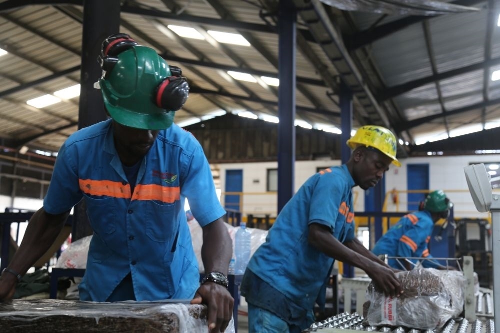 2024年6月10日,在科特迪瓦南部城鎮(zhèn)達(dá)布郊區(qū),工人們在美蘭橡膠加工廠對成品橡膠進行打包。中國加工廠幫助科特迪瓦橡膠增加產(chǎn)品附加值,提高膠農(nóng)收入。