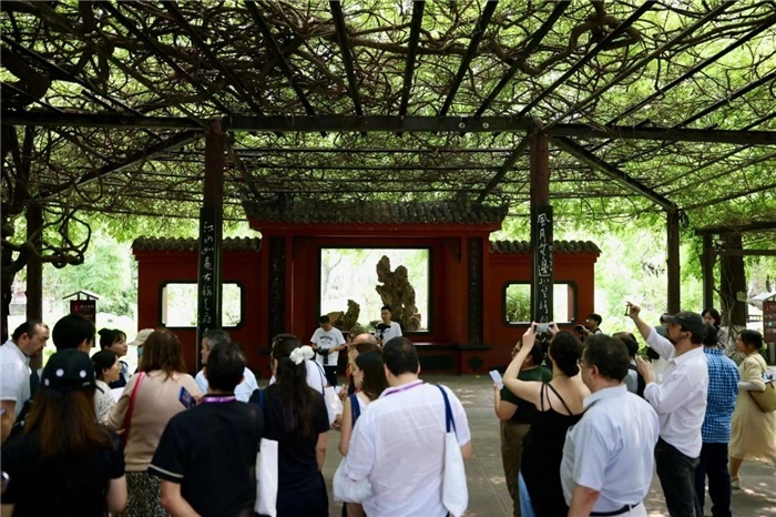 桂湖公園內(nèi)最著名的古建筑之一是楊升庵祠堂。楊慎,號(hào)升庵,是從新都走出的明代四川唯一狀元,他剛正立朝、嚴(yán)謹(jǐn)治學(xué),被稱為明代三大才子之首,“滾滾長(zhǎng)江東逝水,浪花淘盡英雄”便出自他的筆下。公園工作人員向考察團(tuán)介紹,桂湖原是楊升庵的書苑,在這里,他沿湖植歸,摘種荷花,培植風(fēng)景。作為“四川首批十大歷史名人”之一,楊升庵“為國(guó)為民,一片丹心”的家國(guó)情懷和“好學(xué)窮理,精思深索”的治學(xué)精神已成為新都人文精神的象征。