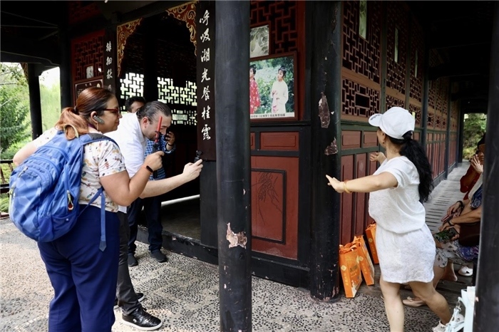 紫藤纏繞,荷葉連綿,位于四川成都新都區(qū)的桂湖公園一片綠意盎然。桂湖公園始建于隋唐時(shí)期,是一座自然環(huán)境幽雅、人文底蘊(yùn)深厚的古典園林。8月30日,2024年“一帶一路”媒體合作論壇拉美媒體采訪團(tuán)來到這里參觀。