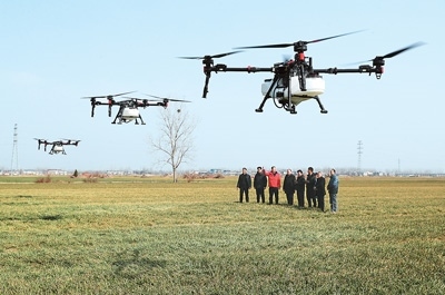 近日,安徽省亳州市蒙城縣樂土鎮(zhèn)屈廟村田間,農(nóng)機技術(shù)人員(左三)向飛手介紹植保無人機作業(yè)的安全要求及注意事項。