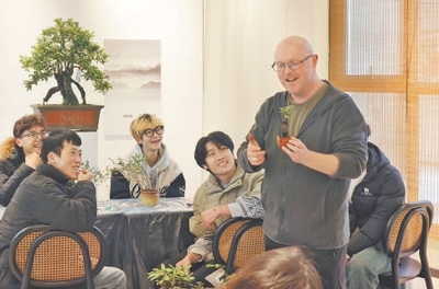 白熊(右一)正在上盆景課。