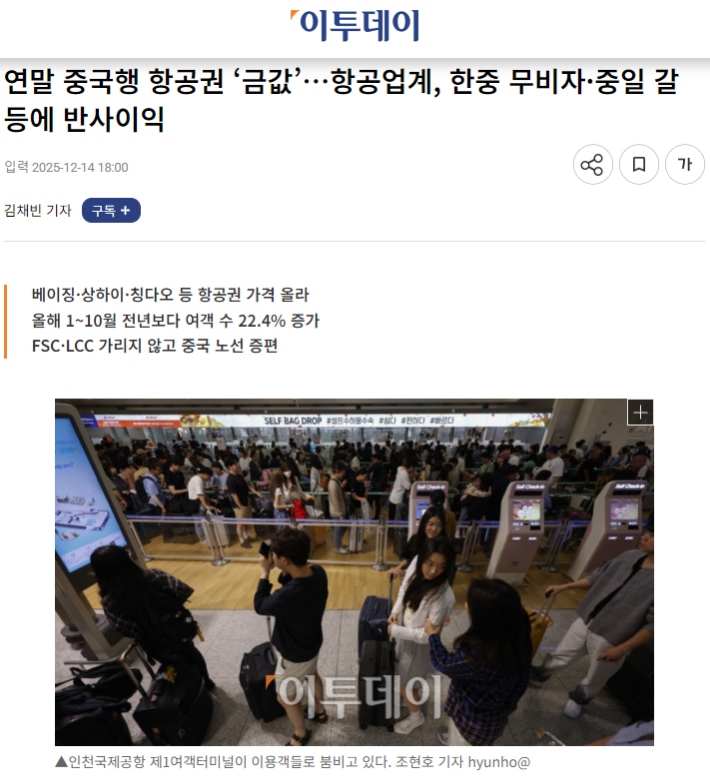 市場旺盛的需求直接傳導(dǎo)至價格層面。韓國《Etoday》近日一篇題為《年底飛往中國的航班“如同黃金般珍貴”》的報道,生動描繪了當前中韓航線的熱度。報道指出,截至12月中旬,韓國飛往北京、上海、青島等主要中國城市的機票價格大幅上漲。例如,大韓航空執(zhí)飛的首爾-上海往返票價已漲至約40萬韓元,濟州航空的韓元-青島航線往返票價也接近30萬韓元。業(yè)內(nèi)分析指出,即便考慮季節(jié)性因素,當前票價仍比去年同期高出約20%。來往中韓“一票難求”,華燈初上的明洞和外灘,熱氣騰騰的烤肉與火鍋,游客們的熱情互動給這個寒冷的冬天帶來暖意。