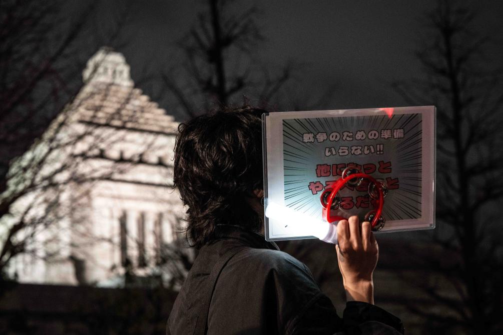 2月24日,在日本東京的眾議院第二議員會(huì)館前,民眾手持標(biāo)語參加抗議活動(dòng)。新華社記者賈浩成攝